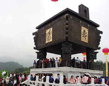 世界最大的青铜鼎 2000年10月8日 09:33 ![]() 中华万寿鼎安装在南岳衡山驾鹤峰上,当地政府为大鼎举行了隆重的落成典礼。该鼎高九点九米、重五十六吨,四周铭铸一万余个有文字记载以来中国不同时期不同书体的“寿”字,被上海吉尼斯认证为“世界最大的鼎”和“世界上寿字最多的鼎”。中新社记者 梁永
