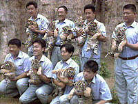 组图:大连动物园创造东北虎年产仔最高记录 2001年07月04日 20:15 ![]() 中国辽宁省大连市动物园饲养的五只东北虎,近日先后产下五胎、十只小老虎,创下东北虎年产仔最高记录。有趣的是,每胎小虎都是一公一母。 ![]() 中国辽宁省大连市动物园新出生的十只小东北虎长势喜人,每只小虎体重由刚出生的两斤增长到十斤左右,让参观的游人爱抚不已。