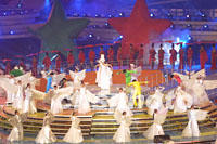 一日晚大运会闭幕式之《青春新世纪》中,表演节目的中国名模被运动员观众簇拥。中新社图 刘殊瑾 摄