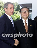 APEC快递:江泽民主席与布什总统举行会谈 2001年10月19日 13:58 ![]() 10月19日,国家主席江泽民在上海西郊宾馆会见美国总统布什。中新社图 ![]() 10月19日,中国国家主席江泽民在上海与美国总统布什举行会谈。中新社图