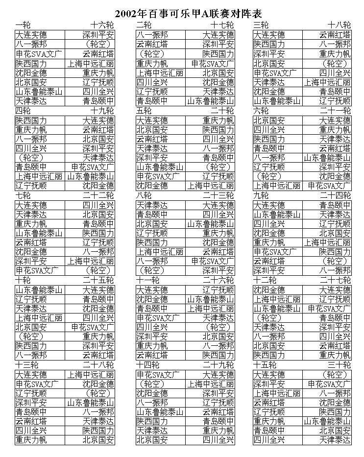 2002年中国“百事可乐”甲A联赛完全对阵表