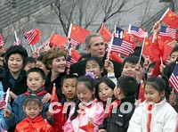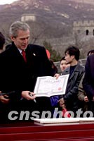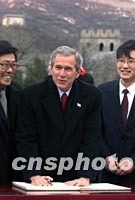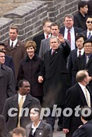 图文:布什总统攀登长城超越尼克松总统纪录 2002年02月22日 20:30 ![]() 中新社记者 毛建军 摄 ![]() 中新社记者 毛建军 摄 ![]() 中新社记者 毛建军 摄 ![]() 中新社记者 毛建军 摄 ![]() 中新社记者 毛建军 摄 中新社北京二月二十二日电 题:布什总统长城书写“和平” 中新社记者 陈静 虽然已是早春时节,北京依然寒气袭人。正在中国进行工作访问的美国总统布什在时隔二十六年后再次登上雄伟的中国长城,书写了他对两国人民永远和平的美好愿望:“Peace to our people and best wishes”。 如巨龙般的长城在崇山峻岭间蜿蜒曲折,延绵五千多公里,其间密布着烽火台和敌楼。它是世界上最宏伟的古代军事防御工程。经历了两千多年的风雨沧桑,万里长城挡住了从北方袭来的风沙,更抵御了无数次北方游牧民族的侵袭。距离北京市七十余公里的八达岭长城是明代长城的精华。中华人民共和国建国以来,怀着对古老华夏文明的崇敬与向往,每一位来到中国的美国总统都曾登上长城,领略东方神韵。 一九七五年,来京探望时任美国驻中国联络处主任的父亲时,年少的布什就曾登上长城。从此以后,再登长城成为素有中国情缘的布什的一个宿愿。 二十六年后,已是美国总统的布什终于在他短暂的访问中又一次登上了长城。在攀登长城的过程中,布什健步如飞,兴致盎然。他走得太快了,不得不几次停下来等候夫人。保镖们几乎跟不上他的步伐。布什总统一边攀登,一边对长城的恢弘气势赞叹不已。“Beautiful! Great!”是他一路上使用频率最高的词。 布什总统一边攀登,一边向身边的导游询问长城历史和现状。当导游告诉布什总统,长城是和平的象征时,这位总统表示将把中国人民的美好愿望转告美国人民和北美人民,让人们都来参观八达岭长城。 布什愉快地回忆了一九七五年攀登长城时的情景。他问身边的导游,三十年前,尼克松总统攀登到哪里。当攀登到北侧七百六十米高的敌楼时,导游告诉他,当年尼克松总统就来到了这里。布什兴趣十足地说,他要再向前走几步,要超过尼克松总统当年留下的纪录。 当得知只有少部分人有足够的体力,能够一次登上北侧敌楼和比北侧敌楼更高的南侧敌楼时,布什脸上出现了悠然神往的表情,好象如果不是因为时间已经被推迟了半个小时,回国的专机在等候的话,他一定要爬上南侧的敌楼,再当一次“好汉”。 布什总统登长城结束了,在一百多名北京少先队员的歌声中,在孩子们纯洁和真挚的祝福声中,他和夫人劳拉信步走到孩子们中间,和孩子们合影留念。总统夫妇还接受了八达岭长城管理处颁发给他们的八达岭长城登城证书。 此时,中国长城学会秘书长董耀会来到布什总统夫妇面前,邀请总统在长城上为和平写一句话。布什总统欣然同意。提笔稍思,他在签字簿上写下了“Peace to our people and best wishes”(祝愿我们的人民永远和平与好运),表达了对中美两国人民美好问候。