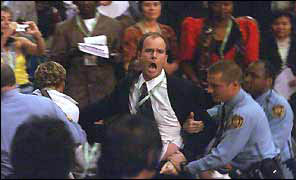 英国广播公司的消息说,鲍威尔批评津巴布韦和提到美国如何应付环境变化的时候,遭与会者嘲笑。多次嘘声和“布什可耻”的口号声使他不得不中断了当天的发言。