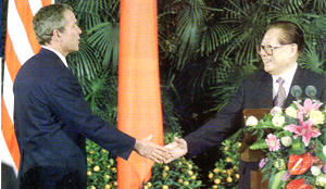 中美:2月21日,中国国家主席江泽民在人民大会堂与来访的美国总统布什进行会晤。