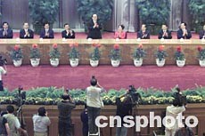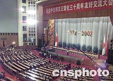 “纪念中日邦交正常化30周年友好交流大会”二十二日晚在北京人民大会堂举行,国家主席江泽民、副主席胡锦涛等中国领导人和桥本龙太郎等日方政要及日本游客一万三千余人参加大会。作者:满会乔