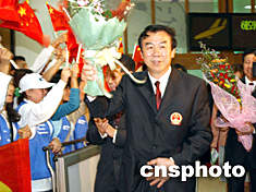 由国家体育总局局长、中国奥委会主席、中国体育代表团团长袁伟民率领的中国体育代表团团部官员及部分运动队,九月二十六日抵达韩国釜山,参加第十四届亚运会。潘索菲 摄