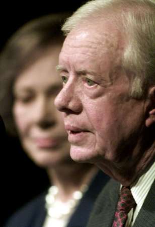 2002年9月25日,吉米-卡特在美国亚特兰大的卡特中心发表讲话,左侧是他的夫人罗斯琳-卡特(资料图片)