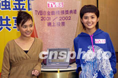 乐坛组合Twins两位成员锺欣桐、蔡卓妍10月23日在香港出席《TVB8金曲榜颁奖典礼2001/2002》记者会,Twins在网上向喜爱的歌曲投票。邓庆乐 摄
