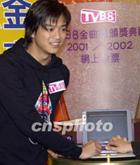 歌星陈晓东10月23日在香港出席《TVB8金曲榜颁奖典礼2001/2002》记者会,为《TVB8金曲榜颁奖典礼2001/2002》在网上为喜爱的歌曲投票。邓庆乐 摄