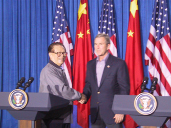 江泽民说,今天我和布什总统也谈到了朝鲜核问题,我们有一个共同的愿望,希望这一问题能得到和平解决。