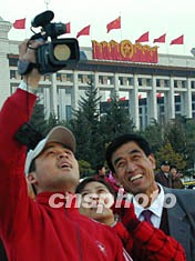 为迎接中共“十六大”召开,天安门广场布置一新,广场日前将巨型灯箱标语牌吊装完成。一名青年十一月初在北京天安门摄像时,吸引好奇的旁观者争睹广场新景。作者:张炜