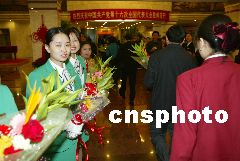 出席中国共产党第十六次全国代表大会的代表五日开始陆续抵京。图为工作人员手持鲜花在代表下榻的酒店热情迎接 毛建军 摄