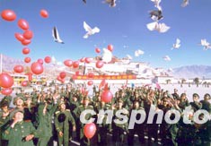 武警西藏总队官兵在拉萨布达拉宫广场打起威风锣鼓,放飞和平鸽和红汽球,热烈庆祝中共十六大召开。作者:赵艳志