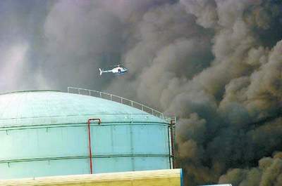 直升机在油库上空盘旋,监视指挥灭火