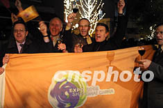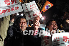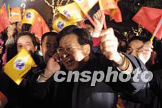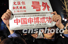三日晚,在摩纳哥梦特卡洛举行的国际展览局第132次会议上,中国上海通过激烈竟争获得2010年世界博览会主办权。图为申城市民在为中国申博成功欢呼。作者:汤彦俊
