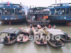 记者今天乘一艘与沉没船相似的客运船到达了沉船打捞现场。记者在现场了解到,沉没客轮“长江一号”已由原来的出事地点向下游移动了近三公里,沉船目前夹在两艘千吨级的驳船当中,打捞公司正在用缆绳固定沉船,为明天打捞出水面作准备。