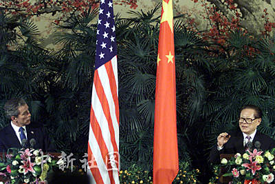 国家主席江泽民与美国总统布什二十一日在北京共同会见中外记者,这是继APEC上海峰会以来两国元首第二次共同会见记者。作者:满会乔
