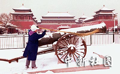 北京连续六天降雪创下百年纪录。二十四日,京城终于雪过天晴,一位保洁工人正在故宫午门前清扫神威大炮上的积雪。作者:张炜