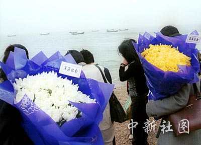 在大连“五·七”空难中失去亲人的家属们,连日纷纷到海滨抛撒鲜花,寄托无尽哀思。作者:王丽南