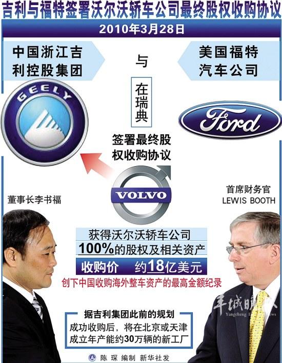 3月28日,中国浙江吉利控股集团有限公司与美国福特汽车公司在瑞典哥德堡正式签署收购沃尔沃汽车公司的协议,吉利以18亿美元收购沃尔沃100%股权。