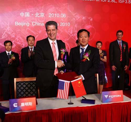 据了解,早在2005年,福田汽车就与康明斯公司开始进行了相关合作的探索,并在2008年3月26日,福田汽车和康明斯以50:50的股比合资成功组建北京福田康明斯发动机有限公司。2009年6月9日,北京福田康明斯发动机有限公司具有年生产40万台高端发动机能力的生产线正式投产,福田汽车还在现场与美国康明斯公司签署了《欧Ⅴ产品技术开发合同》,并就欧Ⅴ以上排放标准的产品开发签署了合作备忘录。