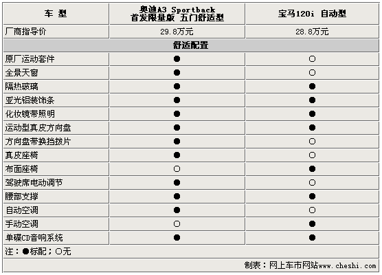 在舒适配置方面,入门的宝马120i可能会让你失望,常见的真皮座椅以及自动空调在这款“纯运动”的车型身上均找不到。而相比之下奥迪A3 Sportback首发限量版就显得更豪华了,这款新车装配了部分奥迪原厂的“S-Line”运动套件,不仅视觉效果更运动,配置也提升了一个档次。