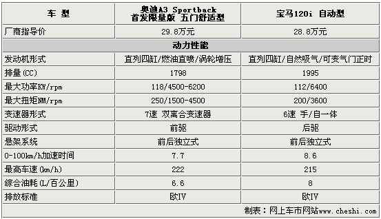 总结: 奥迪A3 Sportback与宝马120i属于不同风格的豪华两厢运动型轿车,首次引进国内的奥迪A3 Sportback胜在了更强劲更高效的动力总成上,在安全以及舒适配置方面也高于宝马120i。而作为“最便宜的宝马车”宝马120i的亮点并不是配置和动力,而是出色的操控性与更响亮的品牌。目前,奥迪A3 Sportback现车不多没有优惠,而宝马120i现车相比之下较多,也有比较高的优惠幅度。