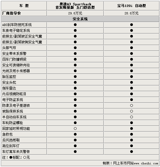 作为高品质的德系紧凑型两厢运动小车,两款车型在安全性方面均体现了很高的水准。除了在这个级别中常见的前排正/侧以及头部安全气帘外,奥迪A3 Sportback首发限量版在安全方面的配置要高于宝马120i,也显得更为丰富周全。奥迪A3 Sportback首发限量版所配备的:防滑电子差速锁、坡路保持以及半自动泊车系统是既安全又实用的配置。