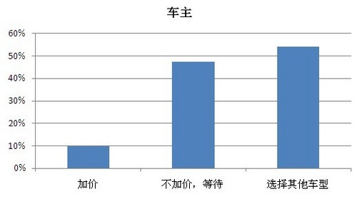 车主二次购车时对加价购车的反感要高于准车主3倍。10%的车主表示接受加价,34%的准车主愿意加价。相比之下,准车主加价购车的可能性是车主的三倍。