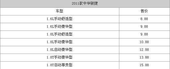 2010年7月8日,华晨中华正式推出了2011款骏捷车型,此次推出的新车共有7款不同配置的车型,分为1.6L、1.8L、1.8T三种动力调教。据悉,新车整体的售价区间为8.88-15.88万元。