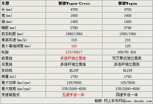 新骏捷WagonCross与骏捷Wagon的车身尺寸基本没有变化,长宽高分别是4700/1800/1450毫米,轴距和前后轮距也没有变化。但新骏捷WagonCross加大了离地间隙,达到了163毫米。另外,新骏捷WagonCross配备的是17英寸轮胎,而骏捷Wagon则配备16英寸轮胎。新骏捷WagonCross采用前后多连杆式设计,骏捷Wagon则采用双叉臂式独立悬架。在动力方面,这两款车并没有太大差别,只不过新骏捷WagonCross采用五速手自一体变速器,比老款骏捷Wagon有很大提高。