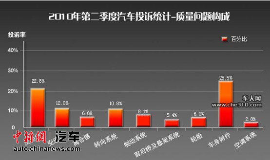 报告显示,投诉统计的具体比例为:发动机占22.8%;变速器占12.0%;离合器占6.6%;转向系统占10.8%;制动系统占8.1%;前后桥及悬架系统占5.4%;轮胎6.0%;车身附件及电气占25.5%;空调系统2.8%。