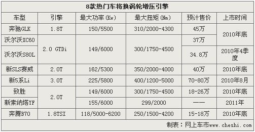 奔驰GLK和沃尔沃XC60作为原装进口车型,将于今年年底左右分别引入搭载1.8和2.0排量的涡轮增压引擎的车型。而作为国产合资车型的新5系Li、沃尔沃S80L、新SLS赛威、致胜、新索纳塔等车型,也将纷纷推出各自排量的涡轮增压车型。除此之外,作为自主品牌代表的一汽奔腾B70,也将推出搭载大众1.8TSI涡轮增压燃油直喷引擎的车型。