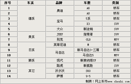 从上表我们可以看出,德系换代车型占据大部分,同时A6、A8、5系、X3和新途锐这五款车型都可以称得上是重量级车型。其次是美系和日系车型都将分别推出两款和三款换代车型,JEEP指南者、别克GL8和英菲尼迪新M、全新三厢马自达3和全新马自达5。现代汽车也将推出全新一代的索纳塔YF,这应该是中国消费者接触到的第三款车型了。同时路虎的新揽胜、沃尔沃的新S60和萨博全新9-5这些重量级车型也将相继登场。在这些换代车型中轿车的比重比较大,共计8款车型。SUV为4款车型,MPV车型2款。