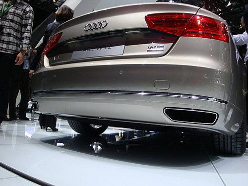 全新奥迪A8L W12 quattro在车身外观上还有一系列的改进,包括单幅式水箱进气格栅,其中间为铬金属喷涂的横条装饰。在其空气通风口以及侧后视镜边缘还拥有铬金属的嵌入物装饰。其进气格栅处及车尾还配有W12的标志,以显示该车身份的不同。梯形的双尾气排放管与后保险杠完美的结合在一起。