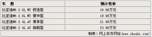 据比亚迪经销商处销售人员介绍,M6将在20日正式上市,预热宣传活动已经全面展开,将推出2.0L手动舒适型、豪华型和2.4L自动尊享型、旗舰型,预定价为16.98-23.98万,前期预定该车的客户可享受优先提车、提车不加价等优厚待遇。
