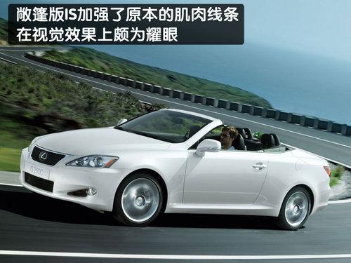 雷克萨斯IS硬顶敞篷版的车身前半部的造型设计,与轿车版本的IS车系拥有极为神似的设计,前保险杠、头灯、后视镜以即车门把手都和轿车版本的IS车型相同。在车身侧面,敞篷版IS加强了原本的肌肉线条,无论是开篷后的拉风身影,或是关篷时的跑车线条,都充满了跑车的动感效果;车尾部分,敞篷版IS则采用全新的LED尾灯设计,以区别和轿车版本的差异,在视觉效果上颇为耀眼。