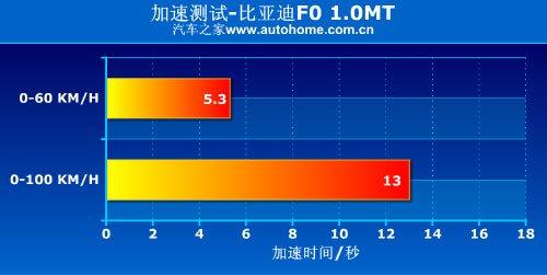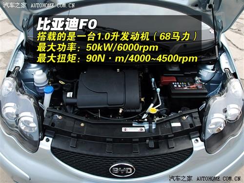 比亚迪F0搭载的是排量为1.0L的3缸全铝发动机,最大功率为68马力,最大扭矩90牛米,在国内同级别的车型中,它的动力性是比较出色的,0-100Km/h加速只用了13秒,在微型车中算是比较不错的成绩了,但表现不佳的刹车成绩让人缺乏安全感。关于它详细的测试,可以参考下面的文章: