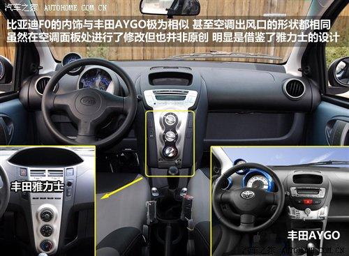 比亚迪F0是目前非常受欢迎的微型车之一,可爱靓丽的造型尤其吸引年轻人的目光,在整个微型车领域中的销量也是名列前茅,当然这与它亲民的售价也是分不开的,然而它俊俏的外表和可爱的内饰却与丰田旗下的两款车有着极度的相似。