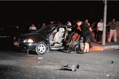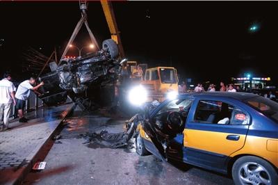 “有‘嗡嗡’的马达声,只看到一道黑影闪过。”目击者翟女士说,当时酒仙桥路上一辆黑色轿车由南向北疾速行驶,“咣”地一声闷响,迎面将一辆羚羊轿车撞得原地打转,随后继续前行。紧接着,不远处再次传来碰撞声,一辆逆向车道上的出租车“被黑轿车顶回去三四米”。黑轿车随即变向,撞坏桥边护栏坠河。