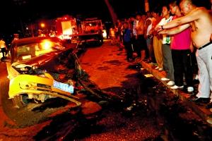 前晚11点半,凯宴仍“躺”在河中,其4个车门紧闭,在岸边看不清楚车内情况。被撞羚羊车及出租车的司机分别被卡在车内,无法动弹。
