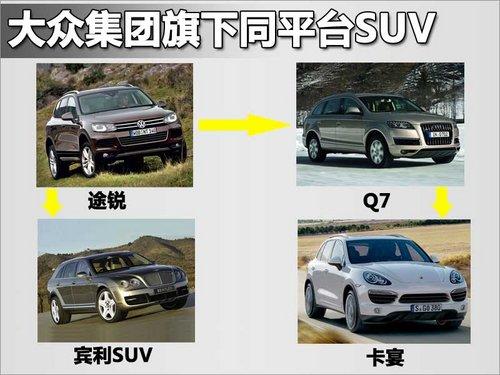 大众集团旗下拥有多个高端以及豪华品牌,例如兰博基尼、保时捷、布加迪还有宾利。其中布加迪、宾利、保时捷在产品上更多的受到了大众品牌在技术上的影响。而在SUV产品方面也亦如此,最为明显的例子在于大众途锐、保时捷卡宴、奥迪Q7的相同平台、部分技术以及零件的共通化就为三款车型带来了更小的研发成本和更短的研发时间。
