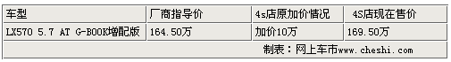如果提到豪华SUV,大家一定首先想到宝马X6、奔驰GL、保时捷卡宴以及路虎揽胜等豪华SUV中的“大佬”们,作为国际知名越野极强悍的汽车品牌,雷克萨斯的每一款车型都可谓经典,而雷克萨斯LX570又重新诠释了豪华SUV的新尺度,与上一代的LX470相比,你却不得不承认雷克萨斯的LX系列正在以跨越的方式完成自己的进化。近日,近日根据网上车市价格检测系统显示,目前雷克萨斯豪华SUV-LX570加价较上段时间的10万元较少了一半,仅加价5万进行销售,而且有现车供应,具体情况请参照下表: