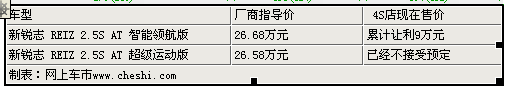 | 新锐志 REIZ 2.5S AT特别纪念版 | 24.08万 | 20.58万 | 3.5万 | 有现车5种颜色全 |
