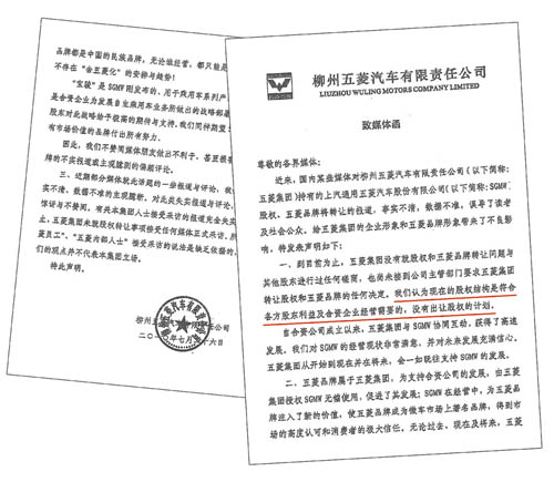 7月26日,柳州五菱汽车有限责任公司(以下简称五菱集团)发表致媒体公开信,明确到目前为止,五菱集团没有就股权和五菱品牌转让问题与其他股东进行过任何磋商,也尚未接到公司主管部门要求五菱集团转让股权和五菱品牌的任何决定。五菱集团认为,现在的股权结构是符合各方股东利益及合资企业经营需要的,没有出让股权的计划……五菱集团从开始到现在并在将来,会一如既往支持上汽通用五菱的发展。