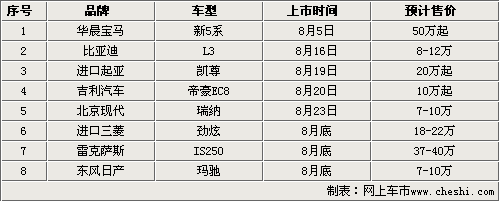 时间进入到8月份以后,我国绝大部分城市都已经进入到了真正的夏天,伴随着酷热的天气各大汽车厂商也纷纷选择了盛夏时节,发布他们自己的最新产品。据记者统计,在2010年8月份里来自国产和进口各类新车达到了8款之多,平均每周就有就有2款新车与我们见面。对于要即将上市的新车,消费者的关注度自然是很高的,下面就让我们提前去看看。
