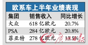 据统计,大众汽车集团销售收入升至618亿欧元,同比增长20.7%。另一家欧洲汽车巨头标致雪铁龙也发布了半年业绩,集团净利润为6.8亿欧元,上半年营业额增长20.8%;日常营业利润提高至11.37亿欧元,而去年同期亏损 8.26亿欧元。(刘俊)