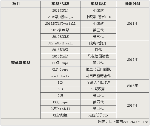 虽然奔驰全新一代CLS轿跑车将在巴黎车展发布,但是正式上市还要等到明年,而在2012年奔驰全新一代CLS双门轿跑车也将推出。而已在国内投产的奔驰新C级轿车将于明年推出小改款车型,在2014年将陆续推出全新一代C级轿车以及酷派和旅行版车型。此外,作为奔驰入门级SUV的BLK车型将于2013年正式推出,从进一步抗衡宝马X1等竞争车型。