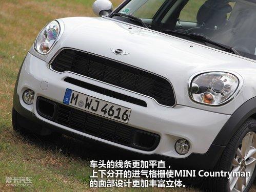从造型上看,MINICountryman并没有完全脱离俏皮可爱的设计路线,虽然车身尺码一再放大,但车头上依旧有些可爱的大灯已经很明确的展现了MINI的一大设计特征,车外后视镜也是100%的MINI风格。车头的线条更加平直,不过你绝不会用硬朗来形容它,上下分开的进气格栅使MINICountryman的面部表情更加丰富立体,即便是充满动感的CooperS,也不会在引擎盖上开一个通风口,而是比较含蓄的放在了上下进气格栅之间。