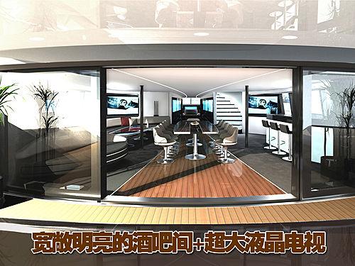 从官方设计图上我们可以看到起奢华的内部装饰,液晶显示屏的操控界面,宽大舒适的驾驶舱座椅,在其船舱还配置了宽敞的酒吧间,木质的地板以及灰色的装饰增添了雅致的风格。此外还有舒适的长沙发以及小型会议桌等等。